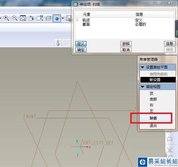 4、如下圖所示,菜單管理器點(diǎn)擊“FRONT面”為草繪平面,