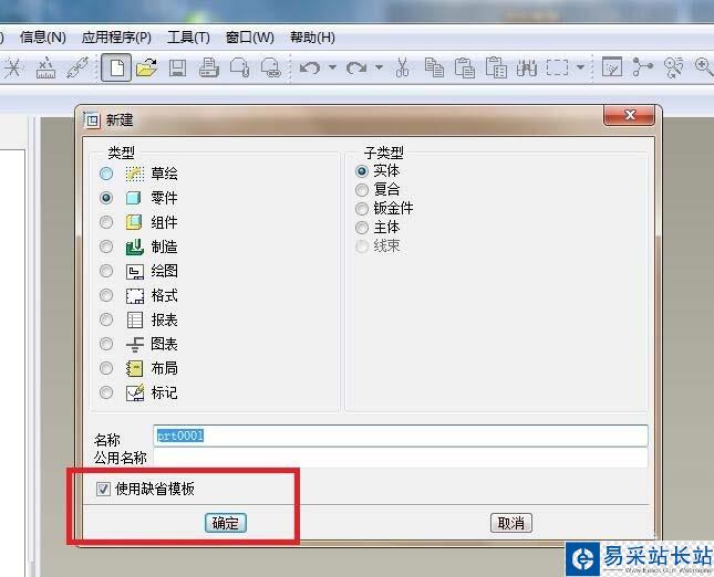 1、如下圖所示,點(diǎn)擊標(biāo)題欄中的“新建”圖標(biāo),點(diǎn)擊“零件”、“實(shí)體”,點(diǎn)擊“確定”。
