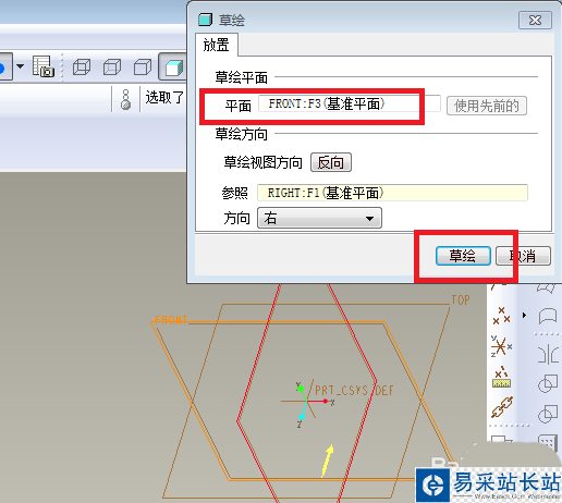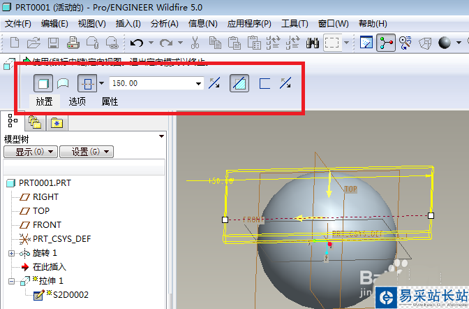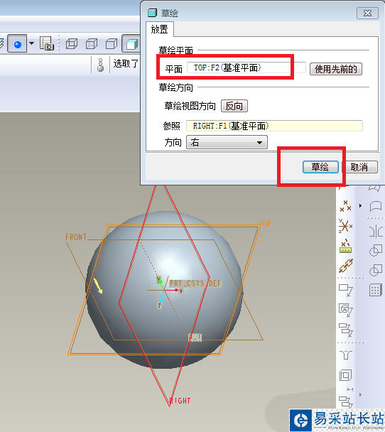 5、如下圖所示,點擊工具欄中的“拉伸”圖標,軟件左上角先回點擊“放置”、“定義”,點擊“TOP面”為草繪平面,點擊“草繪”。