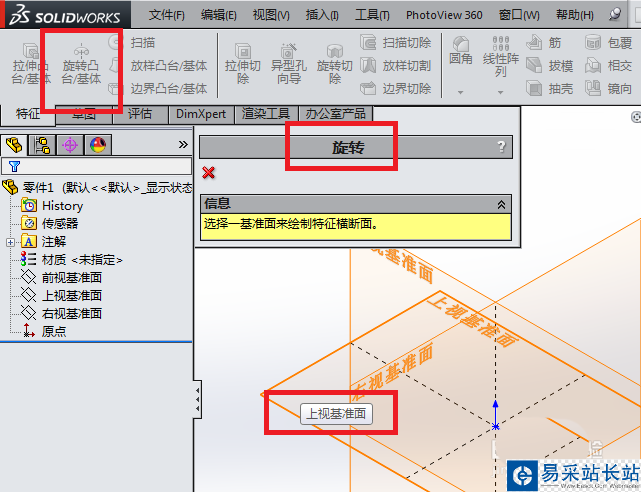 首先點擊工具欄中的“旋轉凸臺/基體”圖標,然后在軟件出現“旋轉”對話框和三個基準面之后點擊其中的“上視基準面”。