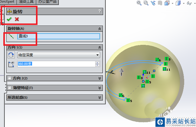 4、如下圖所示,退出草圖之后,來到“旋轉”對話框,因為之前草圖中畫好了中心線,所以這里看著預覽效果,我們可以之間點擊“√”,完成旋轉實體的操作了。至此,鈴鐺的外殼創建完畢。
