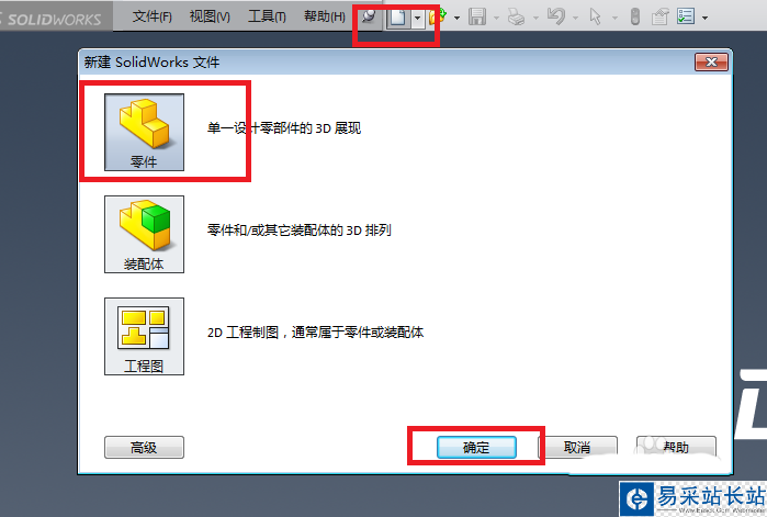 1、如下圖所示,打開SolidWorks軟件,新建一個零件文件。