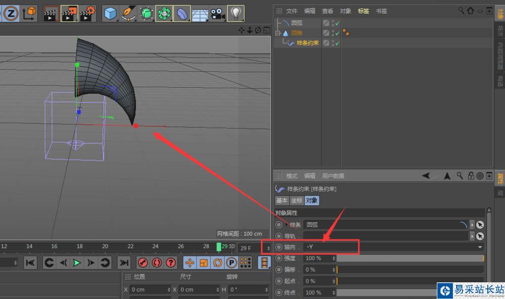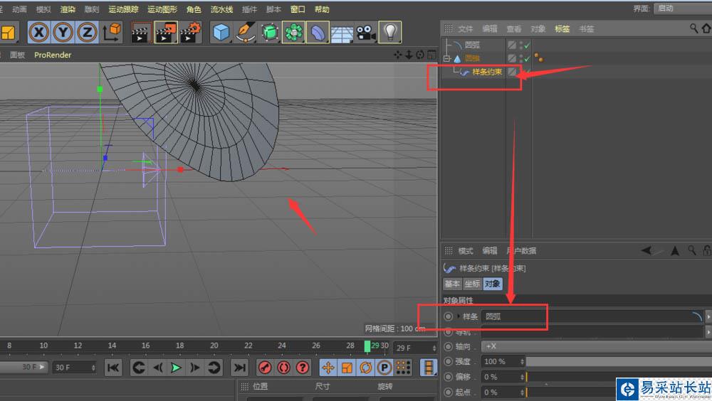 4、選擇樣條約束,將對象作用到建立的圓弧中,如圖所示