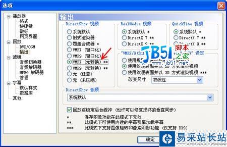 默認情況下,在暴風影音中是無法給RMVB文件加載字幕的,要添加字幕必須進行相應的設置。比如播放本地的RMVB文件,可以打開選項窗口,在左側選擇“回放”下的“輸出”。接著,在右側的窗口中,在“DirectShow視頻”中選擇“WMR7(無轉換)”(圖3)。