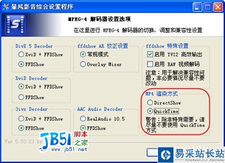在播放采用QuickTime Pro制作的MP4文件時,暴風影音無法進行播放。這是由于默認情況下,標準的MP4文件采用了DirectShow渲染,而采用QuickTime Pro制作的MP4文件采用了QuickTime渲染。具體的設置方法如下:在“開始”菜單中,運行“暴風影音綜合設置”。接著,在打開的窗口左側“任務”中選中“MPEG-4解碼設置”,單擊“下一步”按鈕。然后,在打開的窗口中將“MP4渲染方式”改為“QuickTime”(圖2)。最后,單擊“確定”按鈕即可。