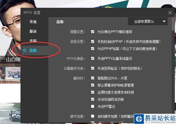 5、在PPTV設置對話框中,選擇左側窗格的“高級”選項卡。如圖所示;