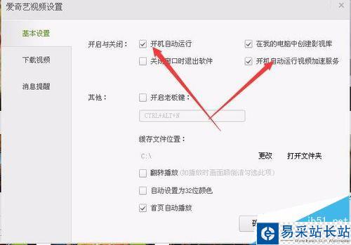 2、在打開的愛奇藝視頻設置窗口中,取消掉“開機自動運行”與“開機自動運行視頻加速服務”前的兩個復選框