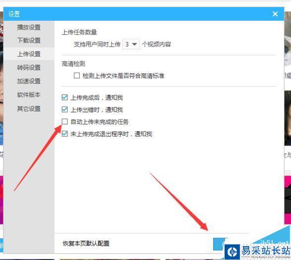 6、在上傳設置選項卡的右側窗格,找到“自動上傳未完成的任務”選項,并將此選項取消勾選,再點擊“保存”按鈕。如圖所示;