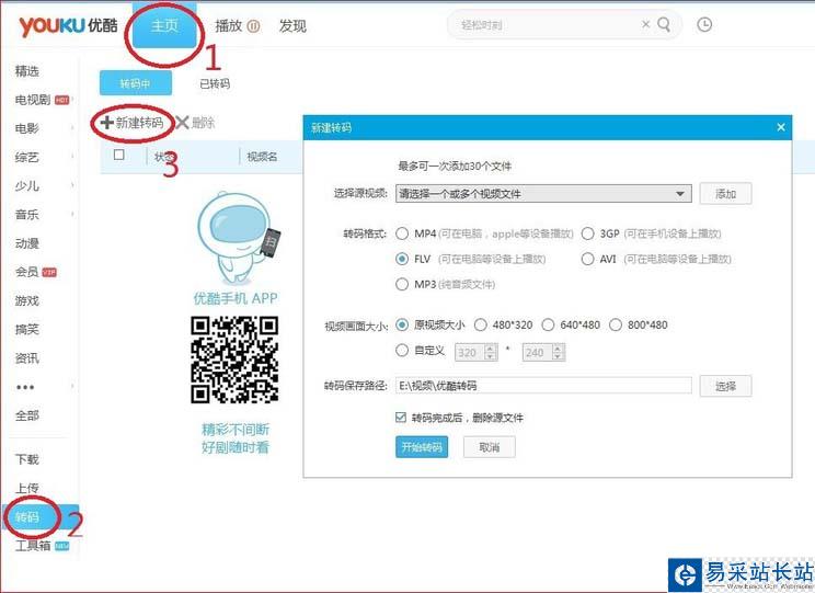 3、接下來在優(yōu)酷客戶端中點擊主頁,然后點擊轉(zhuǎn)碼,然后點擊上方的新建轉(zhuǎn)碼(見圖)。