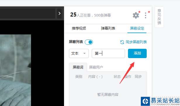 3、如圖所示我們在文本輸入框中輸入想要屏蔽的彈幕關鍵字,然后點擊確定添加即可
