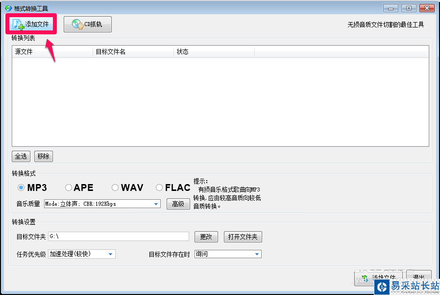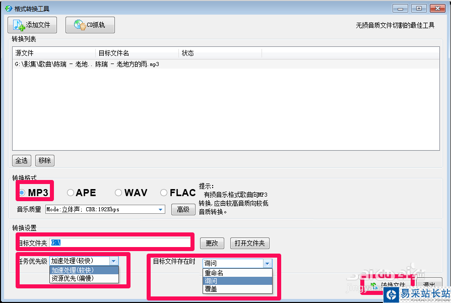 6、此時需要轉(zhuǎn)換的歌曲便顯示在格式轉(zhuǎn)換工具窗口的轉(zhuǎn)換列表中。點擊:轉(zhuǎn)換格式【MP3】,確定目標(biāo)文件夾,【任務(wù)優(yōu)先級】我們可以選擇:加速處理或資源優(yōu)先,【目標(biāo)文件存在時】可以選擇:重命名、詢問或覆蓋,最后點擊:轉(zhuǎn)換文件;