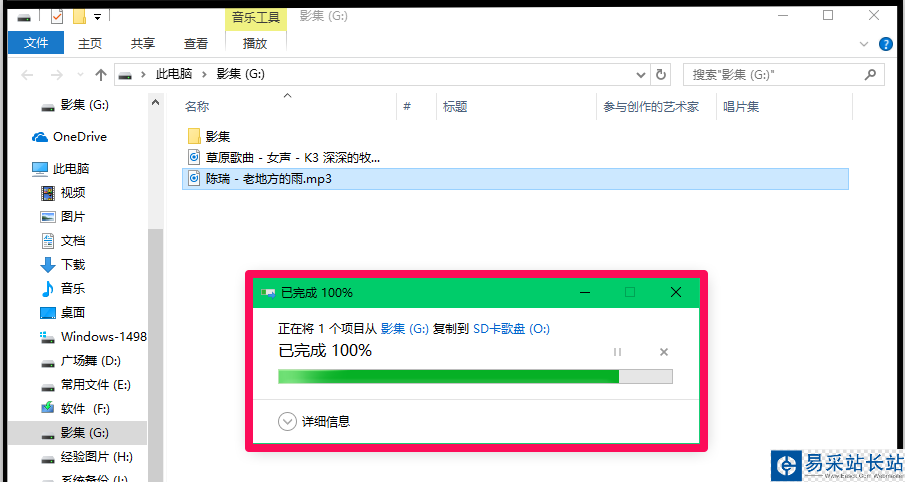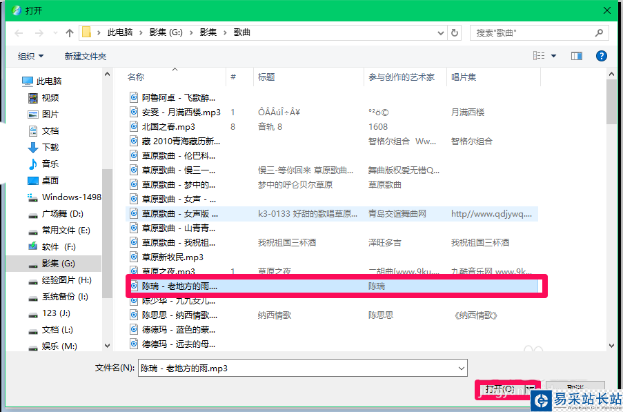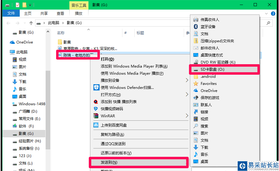 9、在電腦的本地磁盤G中,顯示了轉(zhuǎn)換的歌曲:老地方的雨.mp3,點擊便可以播放,把隨身聽的SD卡插入讀卡器再插入電腦,我們可以把轉(zhuǎn)換的歌曲發(fā)送到隨身聽的SD卡中。右鍵點擊歌曲《老地方的雨》,在右鍵菜單中點擊:發(fā)送到 - SD卡歌盤(O);