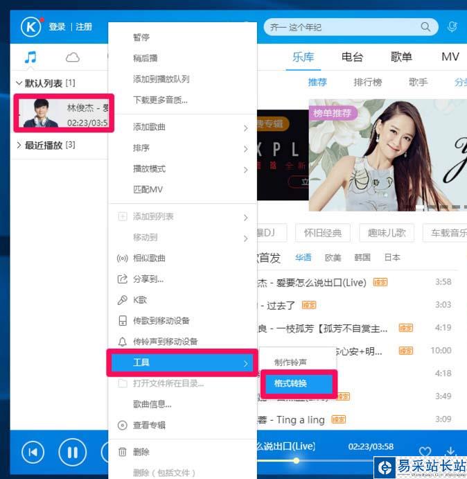 3、右鍵點擊默認(rèn)列表中的歌曲,在右鍵菜單中點擊【工具】-【格式轉(zhuǎn)換】;