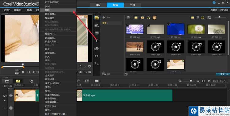 4、在裁切完畢之后,我們就可以將多余的視屏刪除了。選中多余部分,直接按【delete】鍵即可刪除,或者右擊視頻軌上的視屏然后【刪除】。