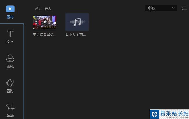 素材/文字/濾鏡/疊附/轉場: 此區域有5個標簽,你可以導入你即將要編輯的素材,運用文字/濾鏡/疊附/轉場到該視頻片段中。