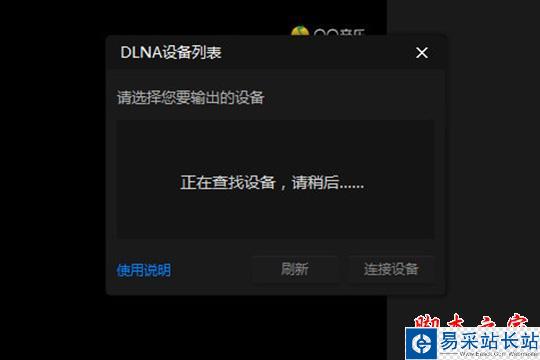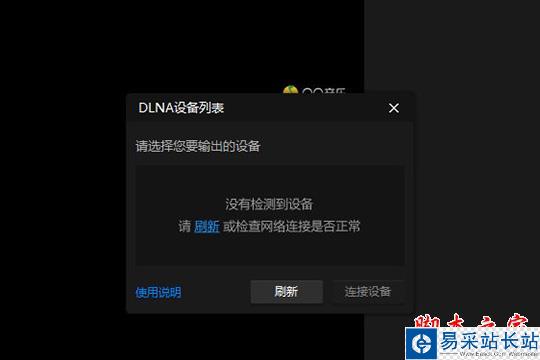 2、在點擊投屏選項之后將會出現(xiàn)DLNA設備列表的界面,選擇想要輸出的設備,輸出的設備必須和當前的電腦連接在一個網(wǎng)絡上才可以實現(xiàn)投屏,否則將會出現(xiàn)沒有檢測到設備的提示,如果還是不知道具體的操作方法,則可以點擊“使用說明”進行使用方法的查看,目前主流的智能電視、盒子和手機都已經(jīng)支持DLNA功能了,如果輸出的設備本身沒有DLNA功能的軟件,則可以在設備上安裝“AirPin”解決你的煩惱,如下圖所示: