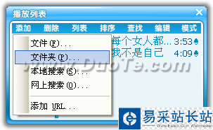 當然,您創建了一個列表就可以把整個音樂文件夾拖放進去,這樣您就可以享受多曲播放的效果啦!“列表”à“新建列表”à選擇新建的列表à“添加”à“文件夾”à選擇歌曲文件,如下圖所示: