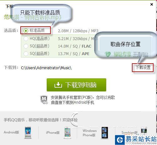 5.音樂品質的選擇,一般用戶默認為標準品質,開通綠鉆就能享受高頻音樂啦!