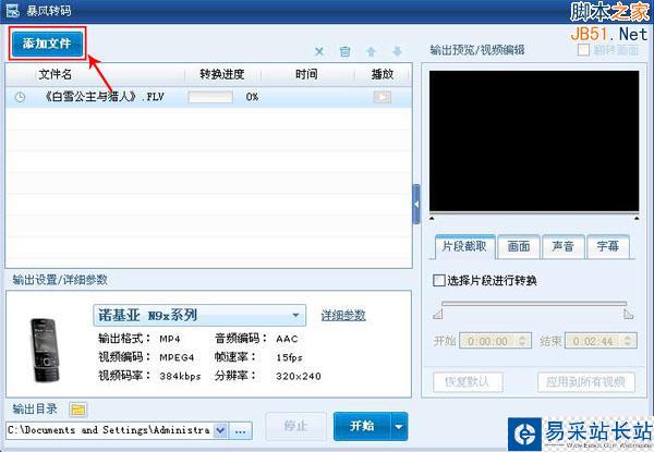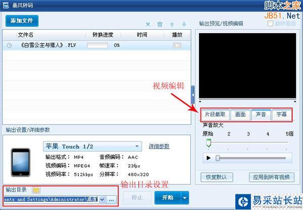 格式選擇完成之后,回到軟件主界面,在軟件的右邊具有視頻編輯功能,其中包括,視頻截取、畫面裁切、聲音縮放及添加字幕等幾項功能。不需要的朋友,可直接設置文件的輸出目錄。