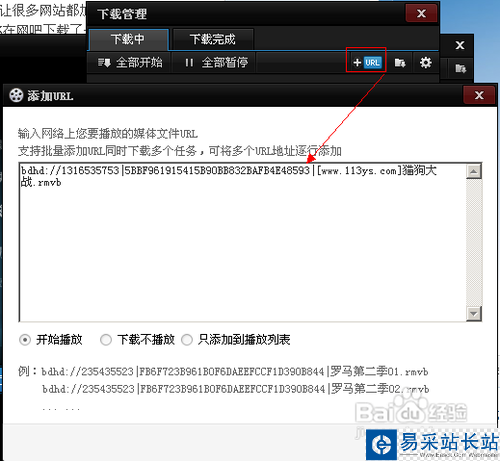 然后用記事本打開(kāi)bdre文件,下面的亂碼不用管,只看上面的鏈接,有兩個(gè),一個(gè)是bdhd開(kāi)頭的,這個(gè)是百度影音專(zhuān)用的下載鏈接,將這個(gè)地址復(fù)制到百度影音下載管理→添加url中(注意鏈接最后有一個(gè)括號(hào)完,那個(gè)不要復(fù)制,它有時(shí)候是*,不同的文件會(huì)變化,只復(fù)制到擴(kuò)展名就行),根據(jù)需要選擇只下載還是邊下邊播之類(lèi)的即可。