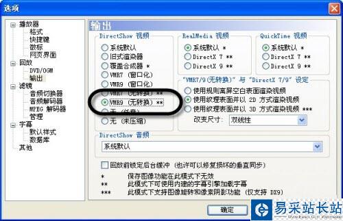 點擊菜單“查看-選項”,接著點擊左面的“輸出”標簽,在右面把“DirectShow視頻”選擇為“VMR9(無轉換)”,選好后點擊“確定”按鈕,然后關掉MPC來重新打開rmvb文件就可以導入字幕文件了(如圖2)。