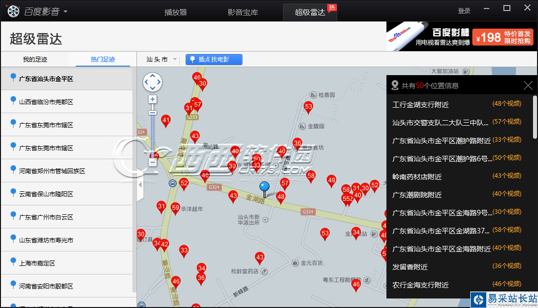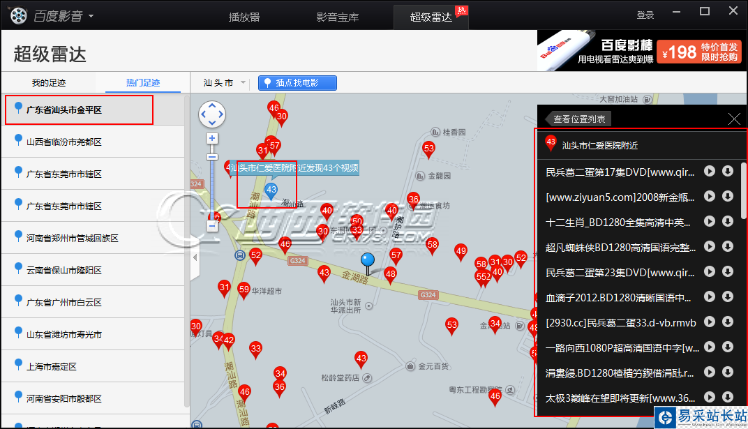 4、熱門足跡中記錄的是使用超級雷達這個功能最多的用戶地區,并記錄了該地區用戶正在觀看的視頻。我們可以通過選擇左邊的地區名來選擇查看當前地區的用戶正在觀看的視頻。