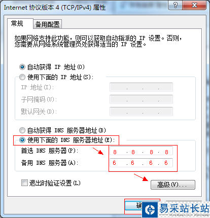 4、勾選“使用下面的DNS服務器地址”,首選設置為8.8.8.8,備選設置為6.6.6.6。IP設置不動,保持原有狀態即可。