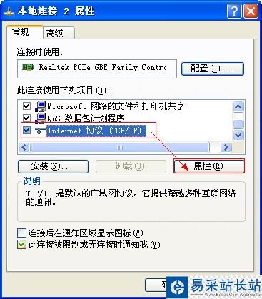 3、選擇“Internet協議(TCP/IP)”,單擊“屬性”打開。(或者雙擊該協議名稱)