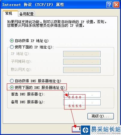 5、勾選“使用下面的DNS服務器地址”,首選設置為8.8.8.8,備選設置為6.6.6.6。IP設置不動,保持原有狀態即可。