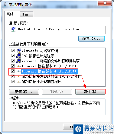 4、選擇“Internet協議版本4(TCP/IPv4)”,單擊“屬性”打開。(或者雙擊該協議名稱)