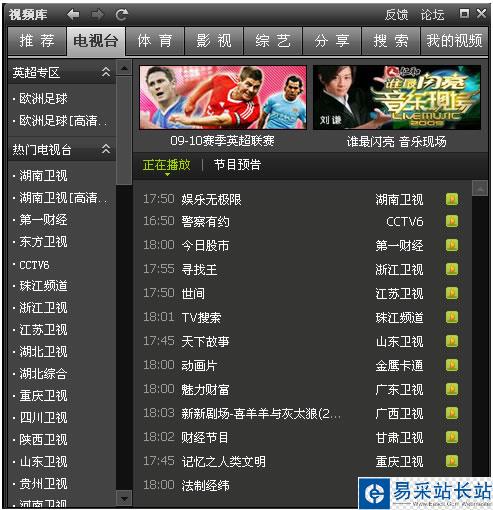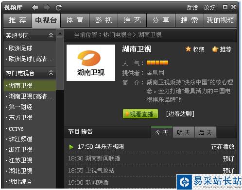 1.所有頻道列表:列出了騰訊視頻播放器提供的所有直播頻道,選擇喜歡的頻道,點擊進入即可看到該頻道的節目預告。如選擇“電視臺”——“湖南衛視”,點擊即可進入“湖南衛視”頻道,點擊“觀看直播”即可開始欣賞該電視臺的節目了。
