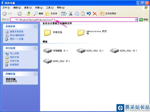 2、 首先打開“我的電腦”,把“C:/Windows/System32/drivers/etc”粘貼到地址欄,然后按回車鍵,進入“etc”文件夾。