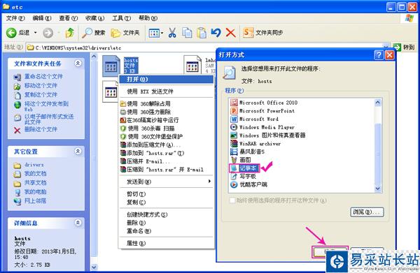 3、找到hosts”文件右鍵單擊選擇打開,然后選擇打開方式,選擇以記事本方式打開“hosts”文件。