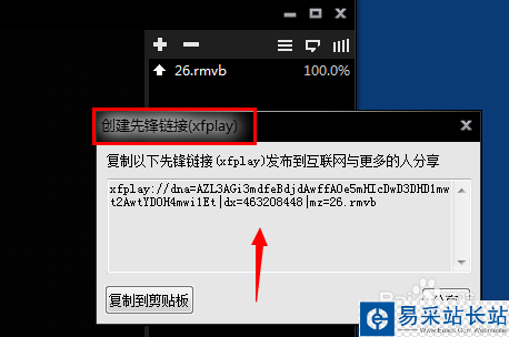 2點(diǎn)擊創(chuàng)建先鋒鏈接(xfplay)之后,會(huì)出現(xiàn)一個(gè)影音先鋒的視頻地址,你可以把地址復(fù)制發(fā)給對(duì)方。進(jìn)行下載點(diǎn)播