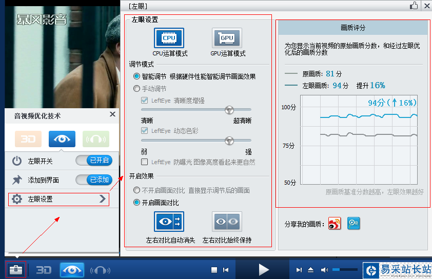 當您播放影片時,您可以在暴風左下角的工具箱內進行左眼設置。同時在設置欄右側還有使用左眼鍵之后的畫面對比評分。