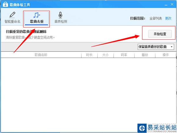 在彈出的歌曲體檢工具中選擇“歌曲去重”功能項(xiàng),然后點(diǎn)擊“開始檢查”進(jìn)行檢查。