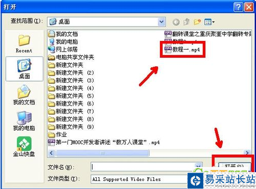 4.在打開對話框里單擊選擇要進行轉換的文件,這里我選擇“教程一.mp4”這個MP4格式的文件,然后單擊[打開]按鈕。