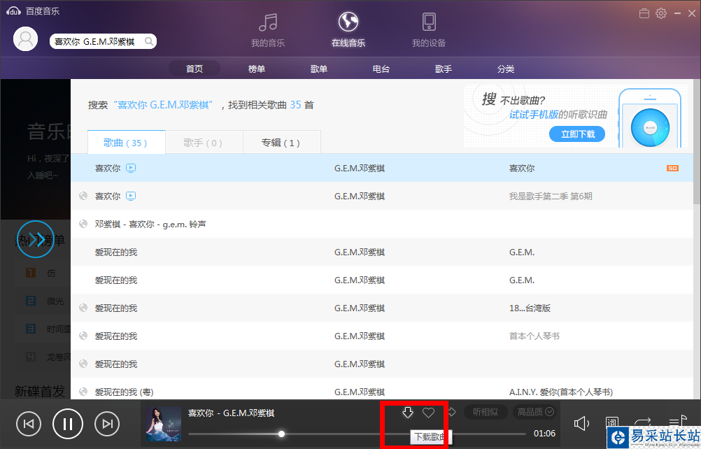 4、點擊播放之后,歌曲就開始在線試聽了,如下圖所示,在播放控制欄上面,可以點擊下載歌曲。