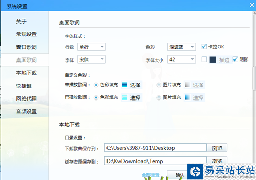 C色彩:一共有6種色彩可供您選擇:分別是水晶藍、黑白憶、亮橙黃、碎花粉、酷炫藍、自然綠;另外,也可以在酷我配置-桌面歌詞中對歌詞進行diy設置;