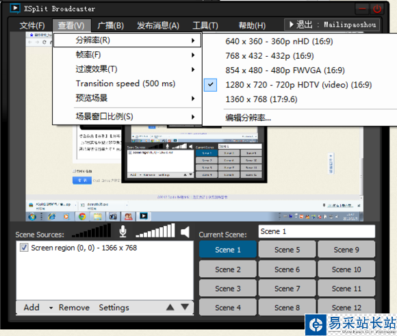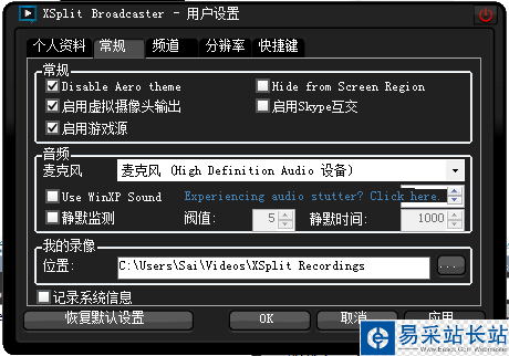 到這里已經基本設置OK了,如果你想錄視頻的話點擊【廣播】【錄制視頻】,第一次會彈出錄制視頻的品質設置,按照下圖的設置,上傳到優酷的視頻就已經是超清的了。電腦硬件不是很好的,可以適當調低畫質,和最大碼率。
