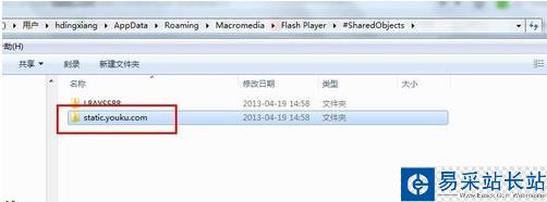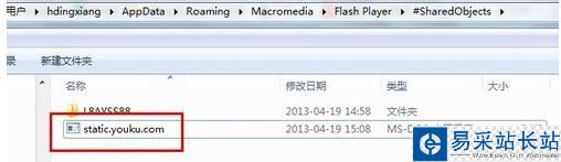 第四步:找到static.youku.com文件夾,這個文件夾在Windows 7中的位置是在C:/用戶/你的當前用戶/AppData/Roaming/Macromedia/Flash Player/#SharedObjects ,Windows XP中的位置在 C:/Documents and setting/你的當前用戶/ApplicationData/Macromedia/Flash Player/#SharedObjects/DXGB5Y7G