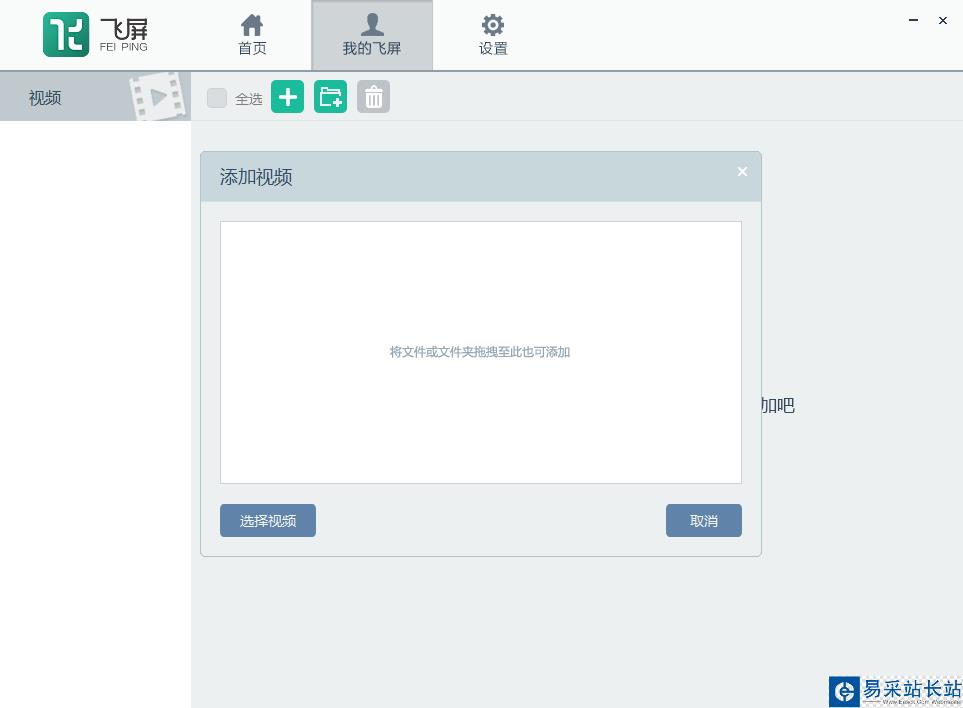 按鈕,彈出添加視頻的面板。您可以直接將視頻文件拖拽至面板中,或點擊“選擇視頻”按鈕選擇視頻。被拖拽或被選擇的視頻將出現在面板的列表中。您可以一次添加多個視頻文件。添加完畢后,點擊面板上的確定按鈕,列表中的視頻就會被添加至飛屏中。