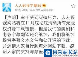 上月底,人人影視字幕站官方微博就曾表示,由于受到版權壓力,將在11月底徹底清除所有無版權資源下載鏈接。隨后這一微博很快被刪除。