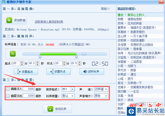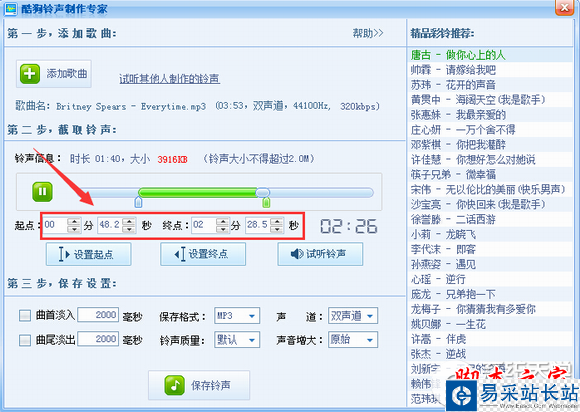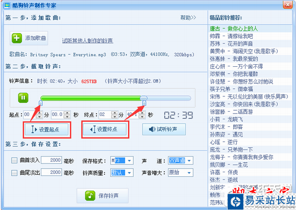 2.進(jìn)入鈴聲制作頁(yè)面,就可以發(fā)揮你的所長(zhǎng)了,跟很多的音樂(lè)編輯工具差不多。最重要的設(shè)置開(kāi)始和結(jié)束時(shí)間,可以鼠標(biāo)點(diǎn)擊,也可以設(shè)定時(shí)間。同時(shí)還有其他很多設(shè)置,我就不一一介紹,你可以去自己嘗試就可以了。同時(shí),還可以試聽(tīng)。如圖。