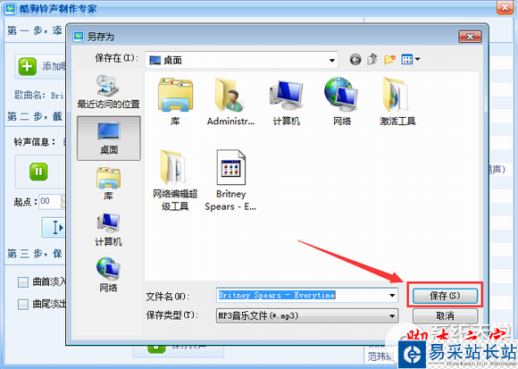3.設(shè)置好,試聽(tīng)沒(méi)有問(wèn)題了,就可以保存了。點(diǎn)擊最上方的保存鈴聲,保存到本地,當(dāng)然你也可以保存到的空間,我選擇保存到本地為例介紹,點(diǎn)擊即可,如圖。