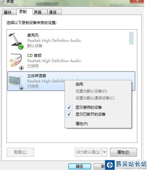 第三步:進入錄制標簽中可見三個設備,看到“立體聲混音”,這個是利用聲卡進行內部錄音的,單擊鼠標右鍵點擊“啟用”