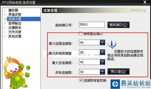 2、在pps網絡電視選項設置中選擇“連接設置”,我們可以將下圖中的連接數盡量設置小一點,設置完成后點擊“確定”按鈕就可以了。