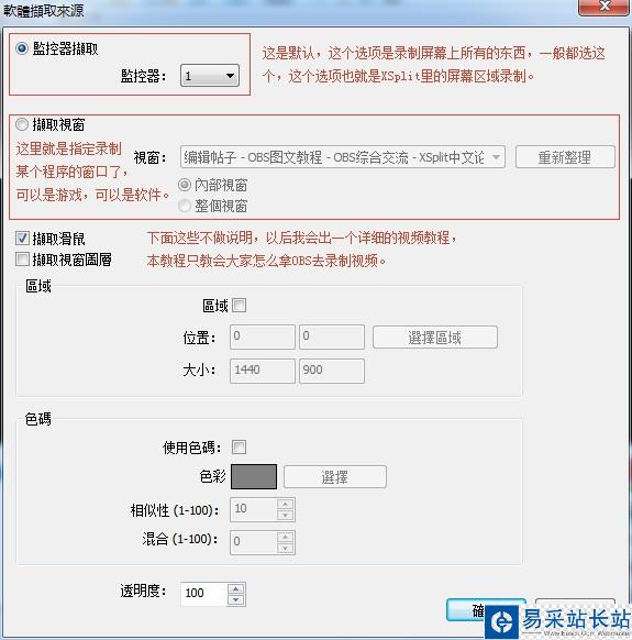 3)看一下上面的圖片注釋,默認即可點擊確定,就可以添加屏幕錄制區域了。