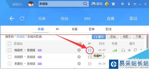 3、在搜索列表出來之后,我們點(diǎn)擊MV下的“觀看MV”按鈕。