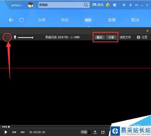 7、錄用完成后,我們?cè)俅吸c(diǎn)擊紅色按鈕就能停止錄音,想要聽聽自己唱的怎么樣?點(diǎn)擊“播放”鍵就能聽啦,還可以點(diǎn)擊分享給好友哦!